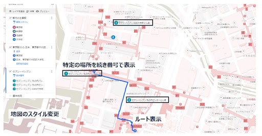 Googleマイマップは、説明文を追加したりアイコンを変更することで、「施設内のサービス表示地図」や「最寄り駅からの最短徒歩ルート表示地図」など、さまざまな用途に合わせてカスタマイズできます。APIも不要なので、手軽にカスタマイズしたい場合におすすめです。