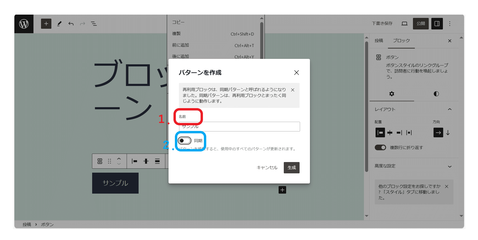「パターン/再利用ブロックの作成」をクリックすると、下の画像のようなメニューが出てくると思います。そうしたらまずブロックパターンに名前を付けましょう。今回は「サンプル」と入力します。