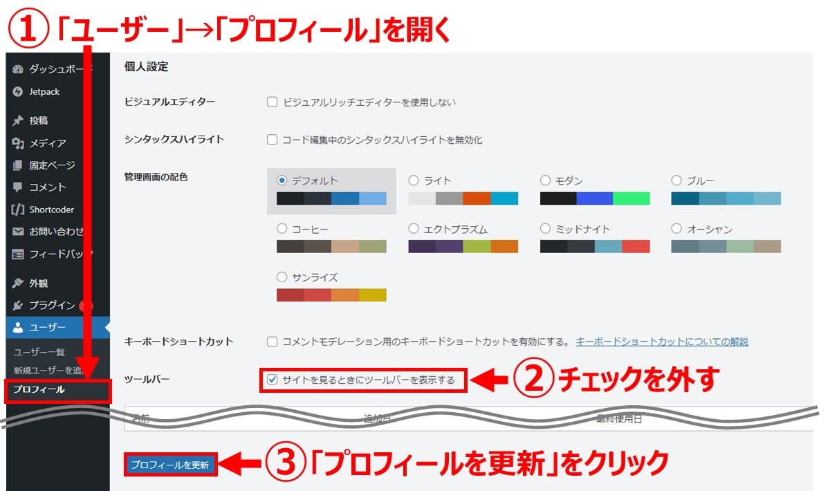 WordPress管理画面から「ユーザー」→「プロフィール」を開きます。画面中ほどにある「ツールバー」の「サイトを見るときにツールバーを表示する」のチェックを外してから、画面下にある「プロフィールを更新」をクリックします。