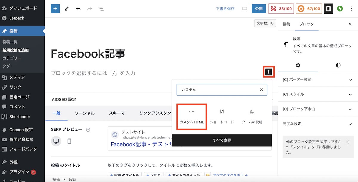 埋め込みたいエリアを開き、「+」ボタンから「カスタムHTML」を検索してブロックを追加します。