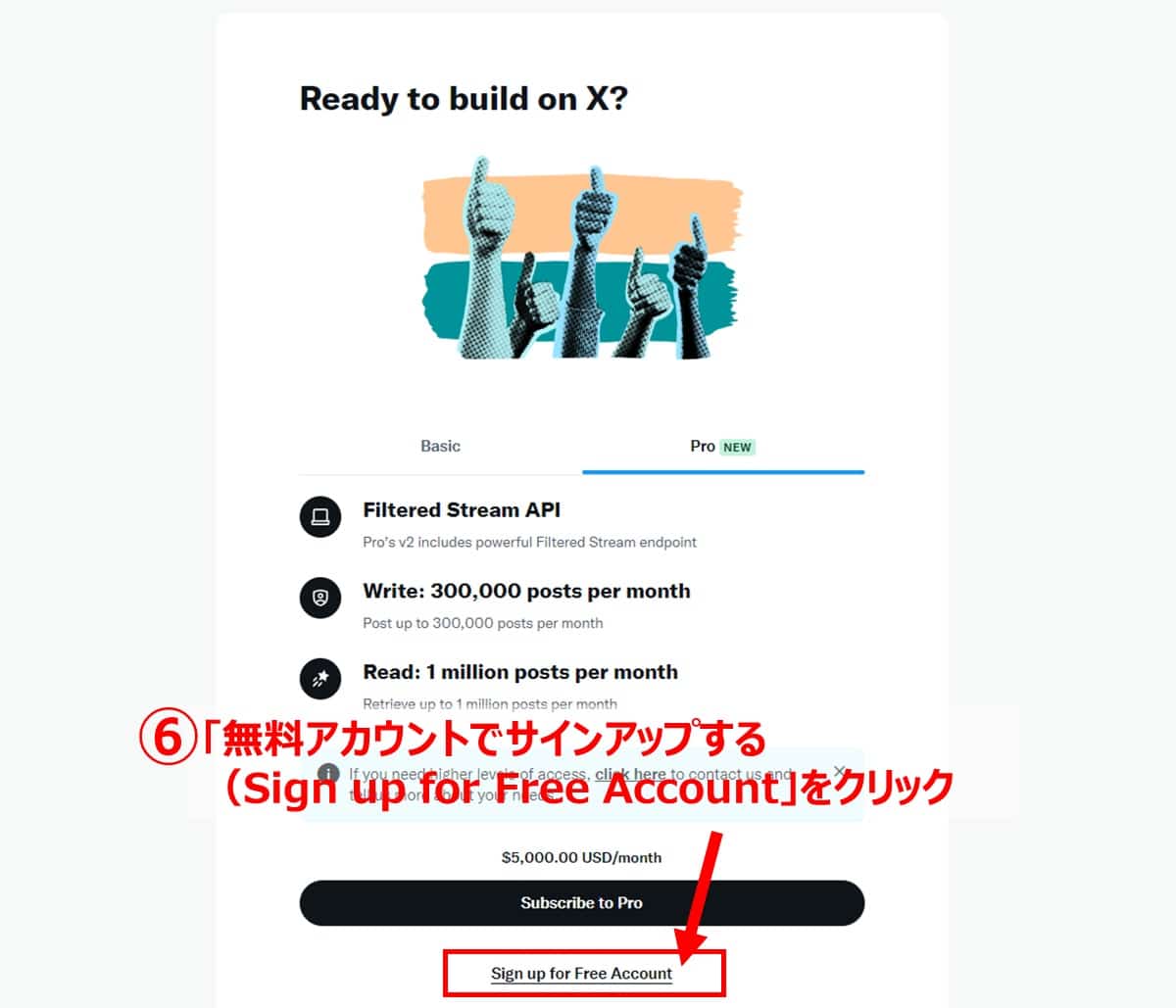 リンク先はX(旧Twitter)サイトです。今回は無料アカウントを作成するため「無料アカウントでサインアップする(Sign up for Free Account)」をクリックします。