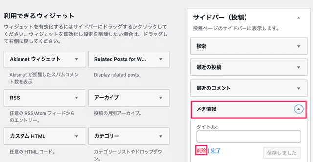利用できるウィジェット画面が表示されたら「メタ情報」から「削除」をクリックしましょう。