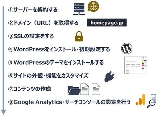 WordPressでホームページを作成する手順は、以下のステップで行います。