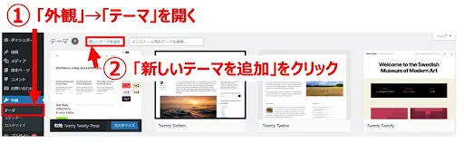 WordPressの管理画面から「外観」→「テーマ」を選択し、「新しいテーマを追加」をクリックします。