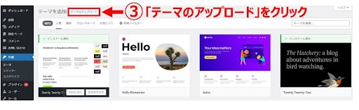 「テーマをアップロード」をクリックして、テーマファイルをアップロードします。アップロード後、テーマにカーソルを合わせて「有効化」をクリックします。