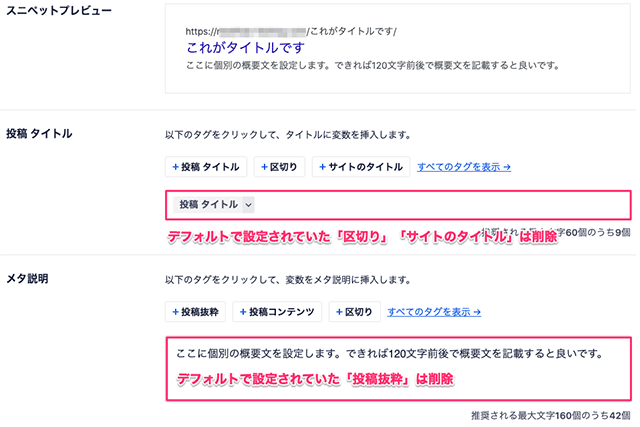 また、メタ説明に関してはデフォルトで「投稿抜粋」が設定されていますが、こちらは手入力でオリジナルの概要文を記載したいため、タグを削除します。