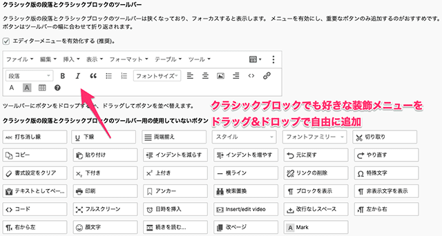 また、Advanced Editor Toolsでは、クラシックブロックのツールバーについても装飾メニューを自由にアレンジできます。