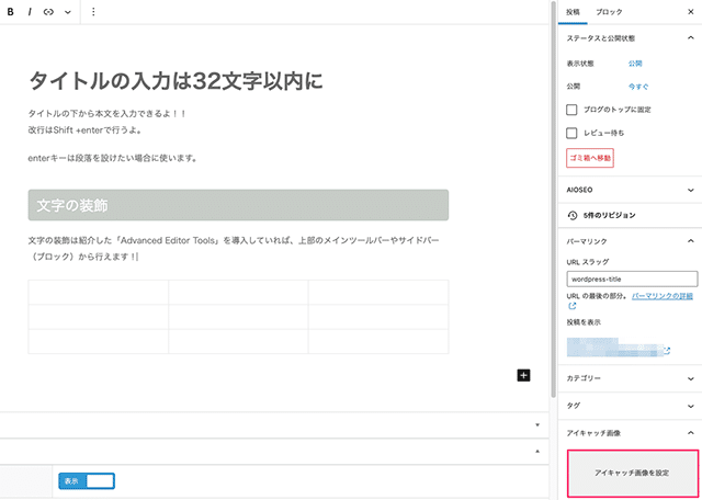 投稿ページの右下にある「アイキャッチ画像を設定」から、アイキャッチ画像をアップロードできます。