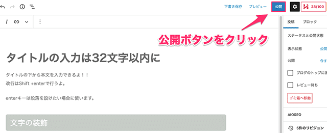 記事の公開は、投稿ページの右上にある「公開ボタン」をクリックすればOKです!