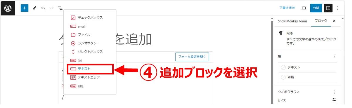 追加したいブロック(今回は「テキスト」)を選択して追加します。適宜、NAME属性やバリデーションを設定します。