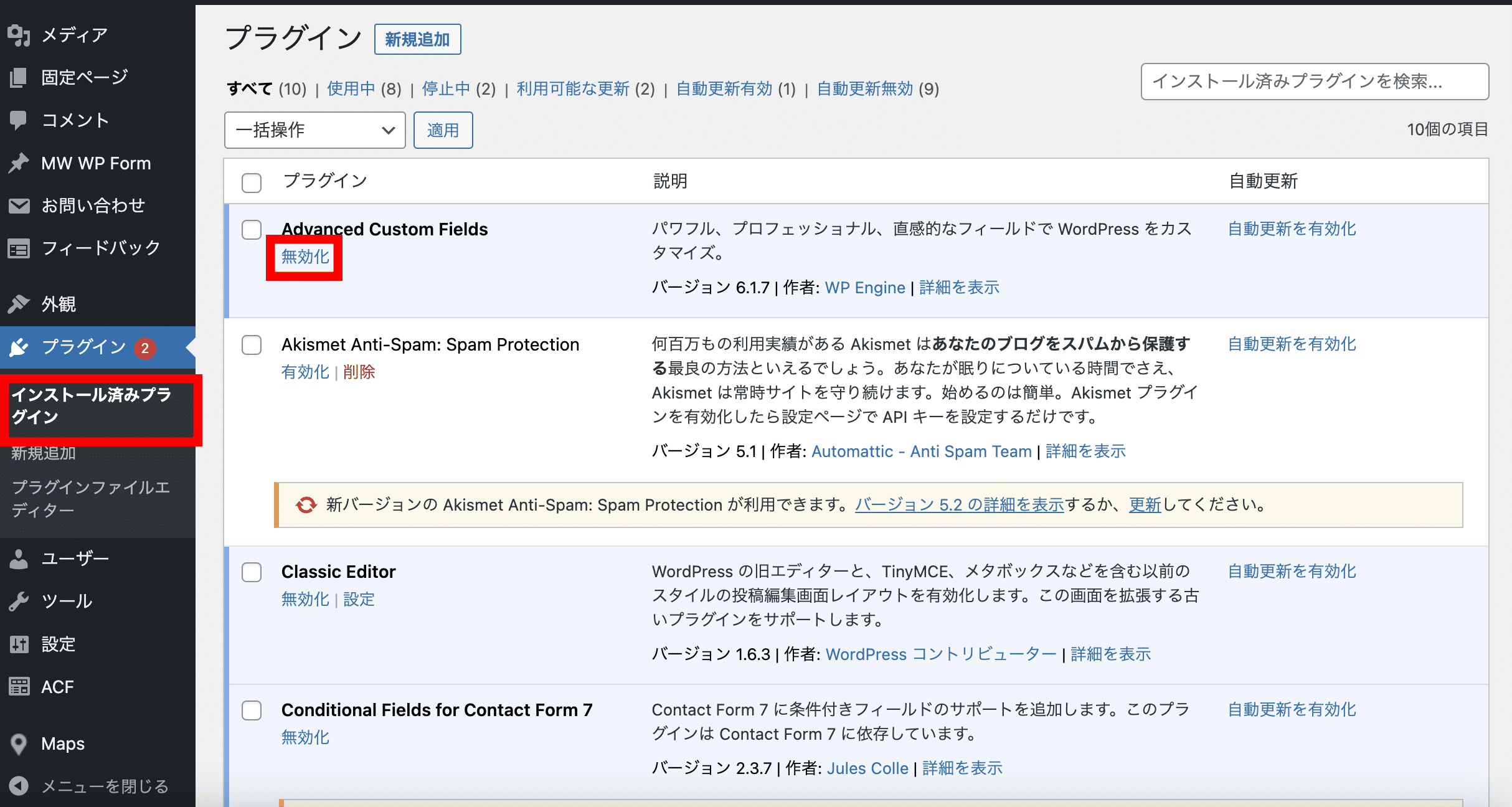 プラグインの無効化は、WordPressの管理画面サイドバー「プラグイン」>「インストール済みプラグイン」から行えます。