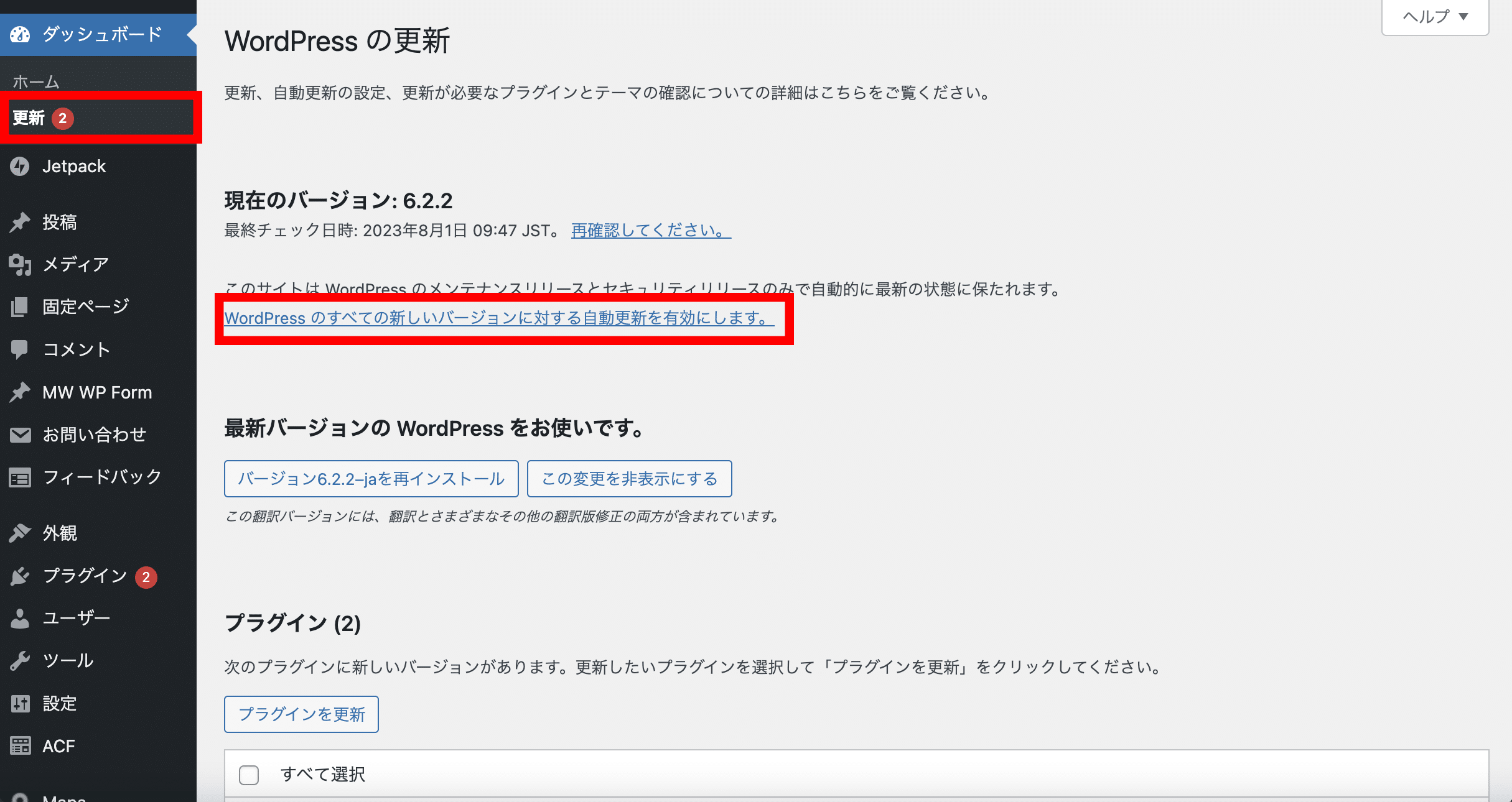 プラグインの無効化を行うと同時に、プラグインの更新も行いましょう。